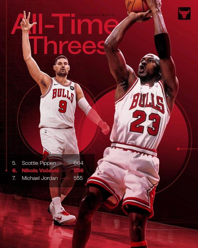 北京时间12月27日,NBA常规赛76人客场对阵公牛,76人在开局13-2领先情况下,随后被公牛反超11分。76人随后再度反超比分,但最后时刻被公牛一波10-0小高潮逆袭,最终公牛109-102赛季双杀76人豪取5连胜,76人遭遇2连败。值得一提的是,武切维奇公牛生涯三分命中数超越乔丹升至队史第6位,也是公牛队史命中三分最多的中锋球员。